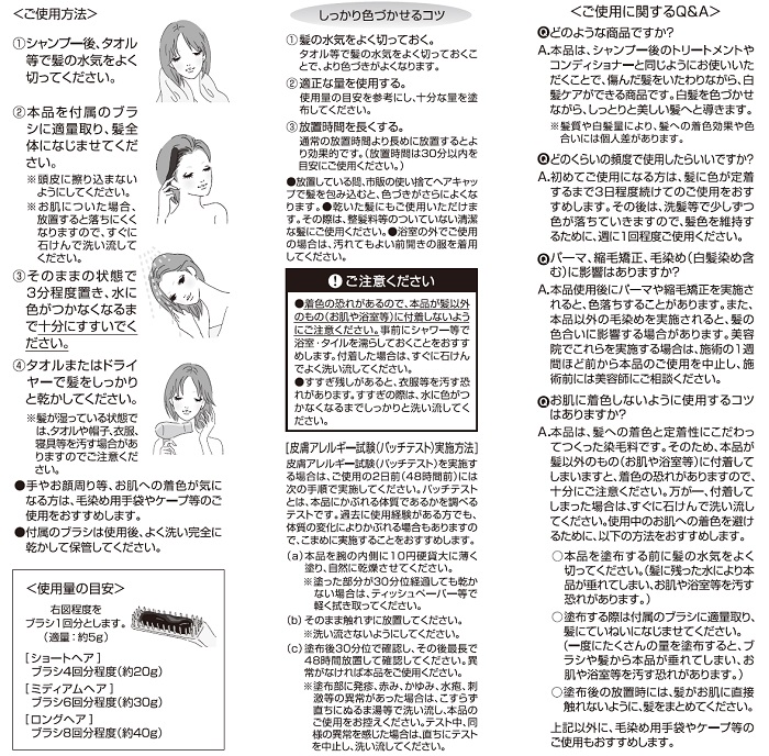 4種の染料※1を配合したオイルインカラートリートメント。髪の毛をしっかりキレイに染め上げ、理想の艶髪に導きます。インド伝承のシロダーラオイル※2を配合し、ダメージケアしながら髪にハリ・コシ・ツヤを与え、指通りなめらかに。まとまりのある理想のふんわり仕上げ。ムラなく仕上げるための専用ブラシ付き。